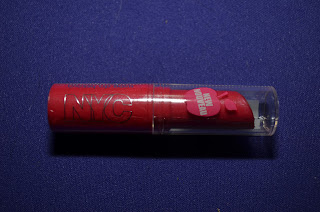 FULL SIZE NYC Applelicious Glossy Lip Balm in Big Apple Red I love lip products so this was a nice find. The stick of the lip balm has a light pink apple on the core. It left a faint hint of red on my lips. You probably wouldn't even notice that there was any color unless you saw it being applied.